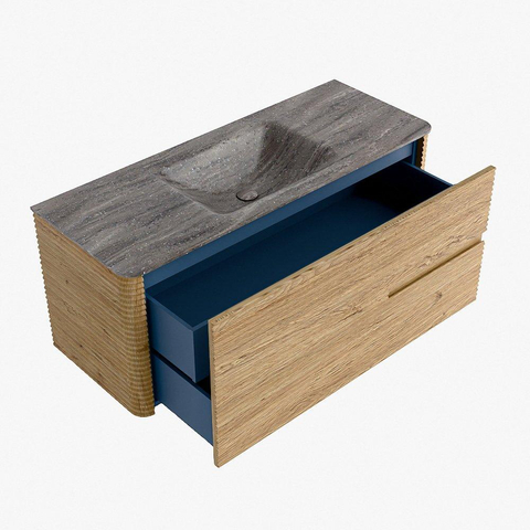 La praticité est un élément essentiel de la gamme CIRO. Le meuble dispose d’un grand tiroir avec un tiroir intérieur supplémentaire, idéal pour ranger de manière organisée tous les articles quotidiens de la salle de bain. Grâce à la poignée intégrée et au mécanisme de fermeture douce, la façade reste sobre, élégante et épurée.