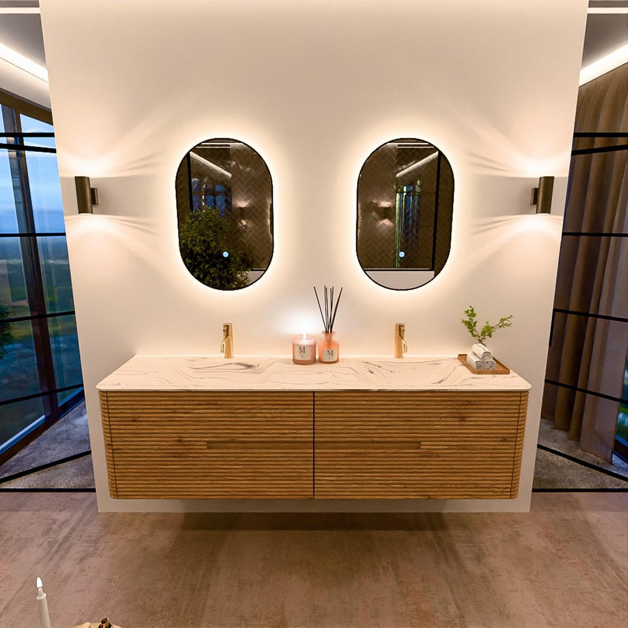 Mondiaz CIRO-DLUX Ensemble de meubles de salle de bains - 180x45x50cm - Lavabo solid surface Nata - 2 vasques double - 2 trous de robinet - 4 tiroirs - Chêne