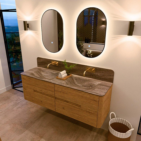 Mondiaz CIRO-DLUX Meuble de salle de bains - 150x45x50cm - lavabo en solid surface Oza - 2 vasques double - sans trous de robinetterie - 4 tiroirs - Chêne