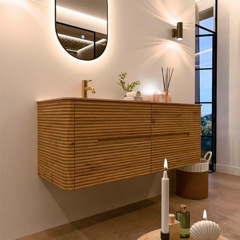 Mondiaz CIRO-DLUX Ensemble de meubles de salle de bains - 130x45x50cm - Plan vasque Solid surface Saba - 1 lavabo à gauche - 1 trou de robinet - 4 tiroirs - Chêne