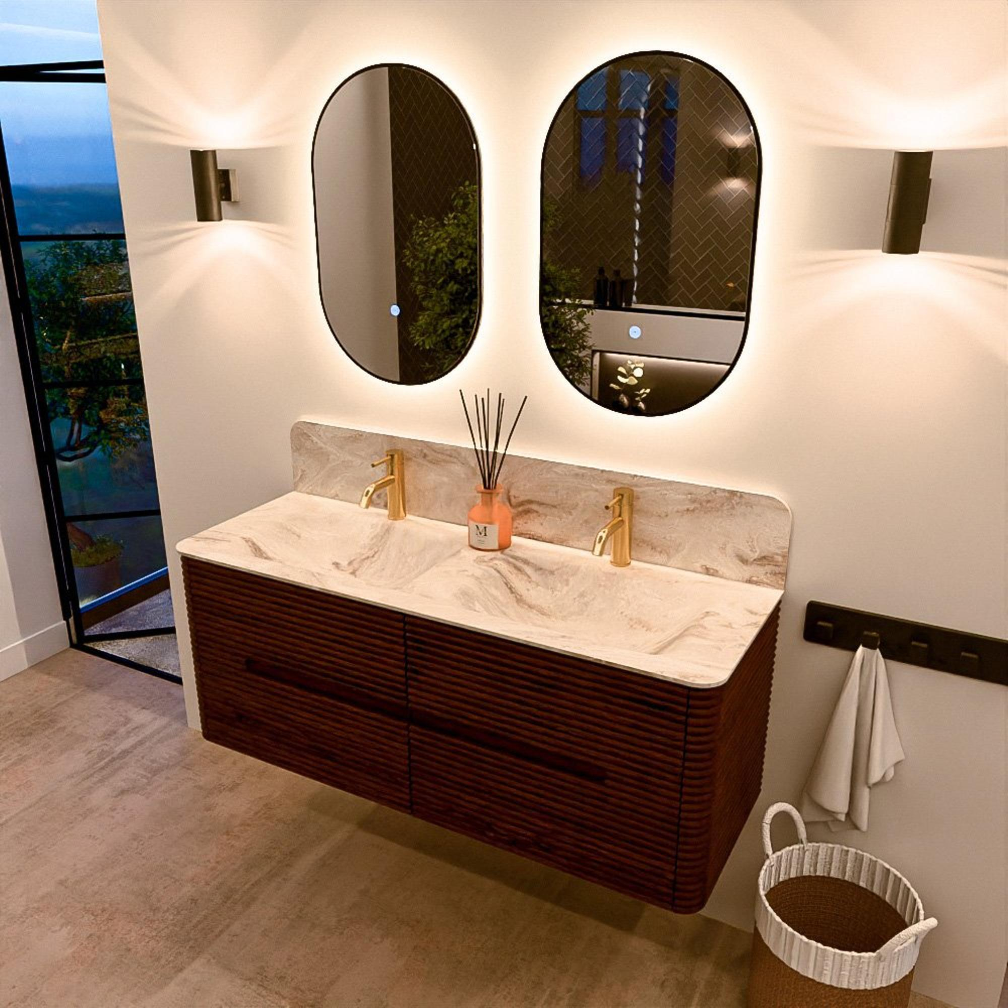 Mondiaz CIRO-DLUX Meuble de salle de bains - 130x45x50cm - Plan vasque solid surface Frappe - 2 vasques Double - 2 trous de robinetterie - 4 tiroirs - Ruby