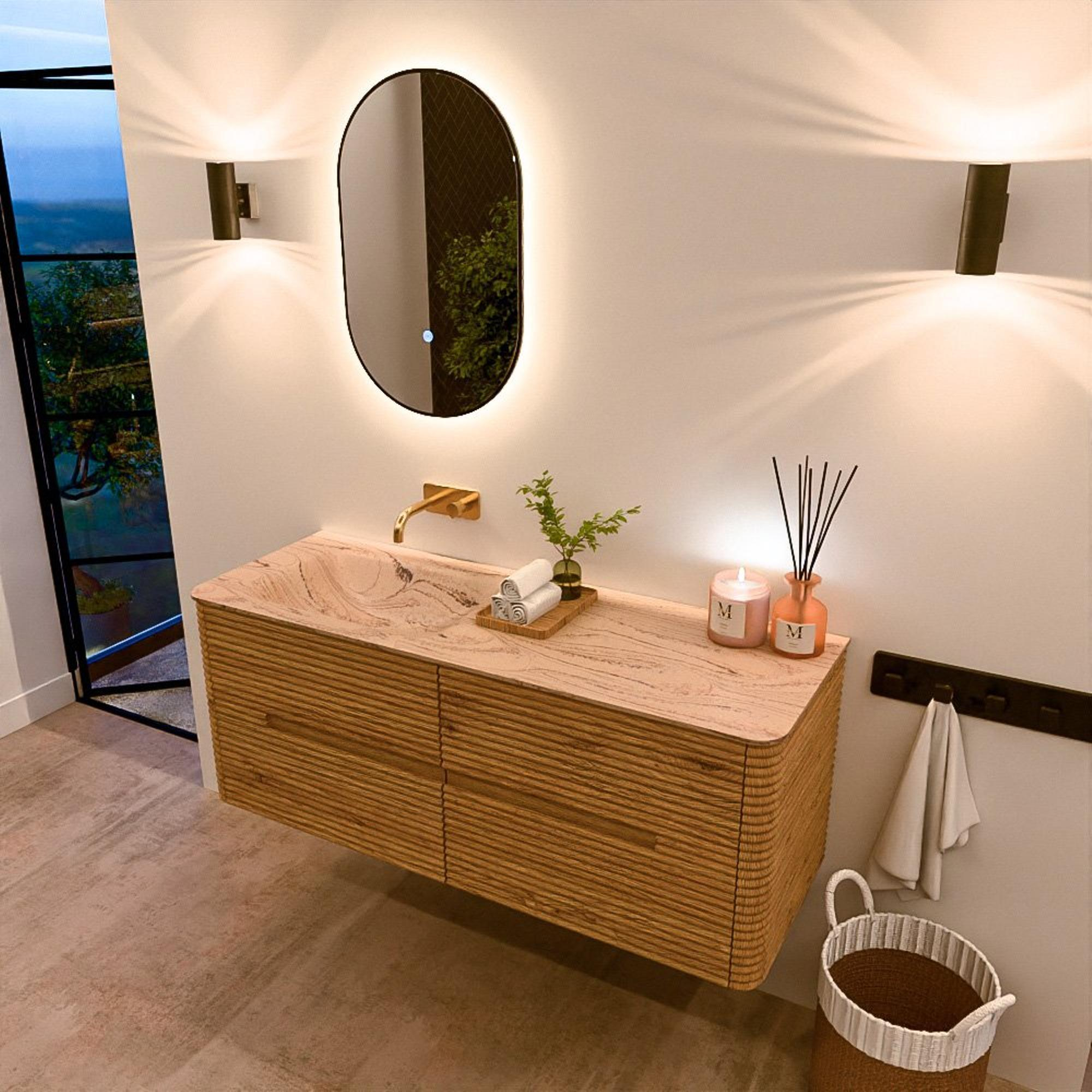 Mondiaz CIRO-DLUX Ensemble de meubles de salle de bains - 130x45x50cm - Plan vasque solid surface Arena - 1 lavabo à gauche - sans trous de robinet - 4 tiroirs - Chêne