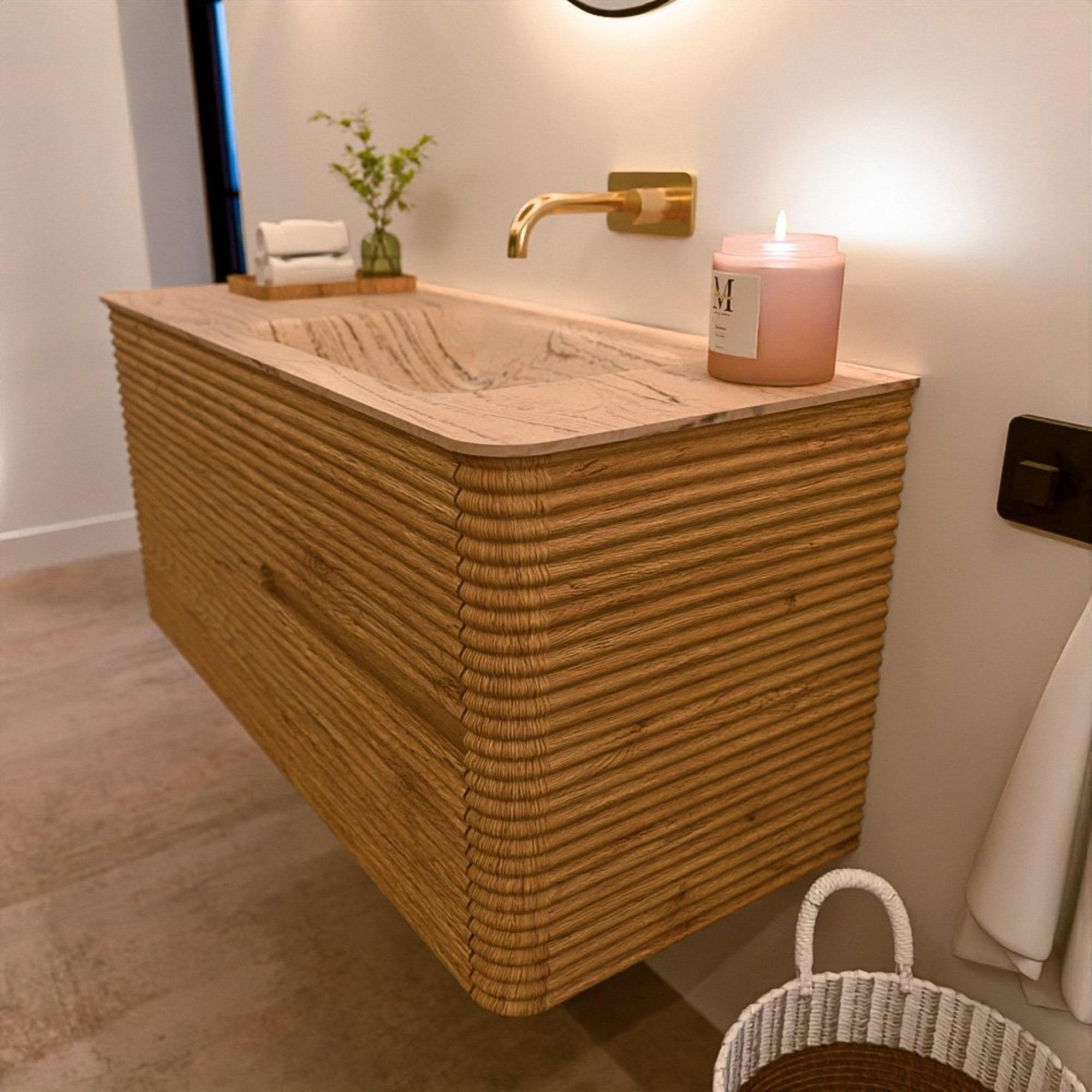 Mondiaz CIRO-DLUX Meuble de salle de bains - 110x45x50cm - plan-vasque Solid surface Arena - 1 vasque à droite - sans trous de robinetterie - 2 tiroirs - Chêne