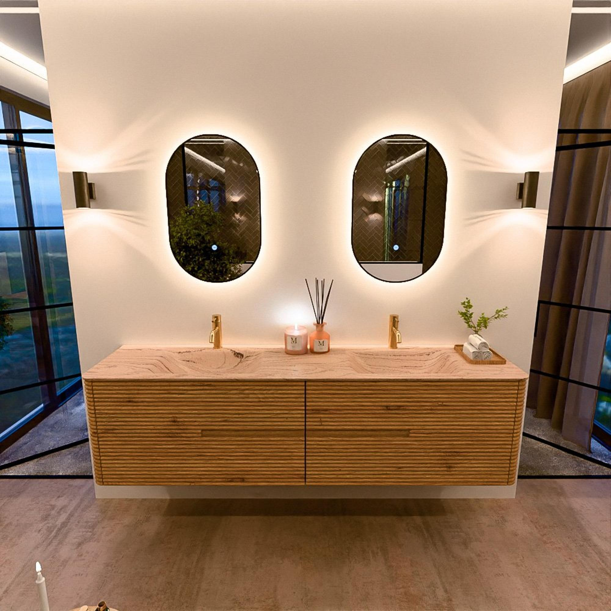 Mondiaz CIRO-DLUX Ensemble de meuble de salle de bains - 190x45x50cm - Plan vasque solid surface Arena - 2 bassins Double - 2 trous de robinet - 4 tiroirs - Chêne