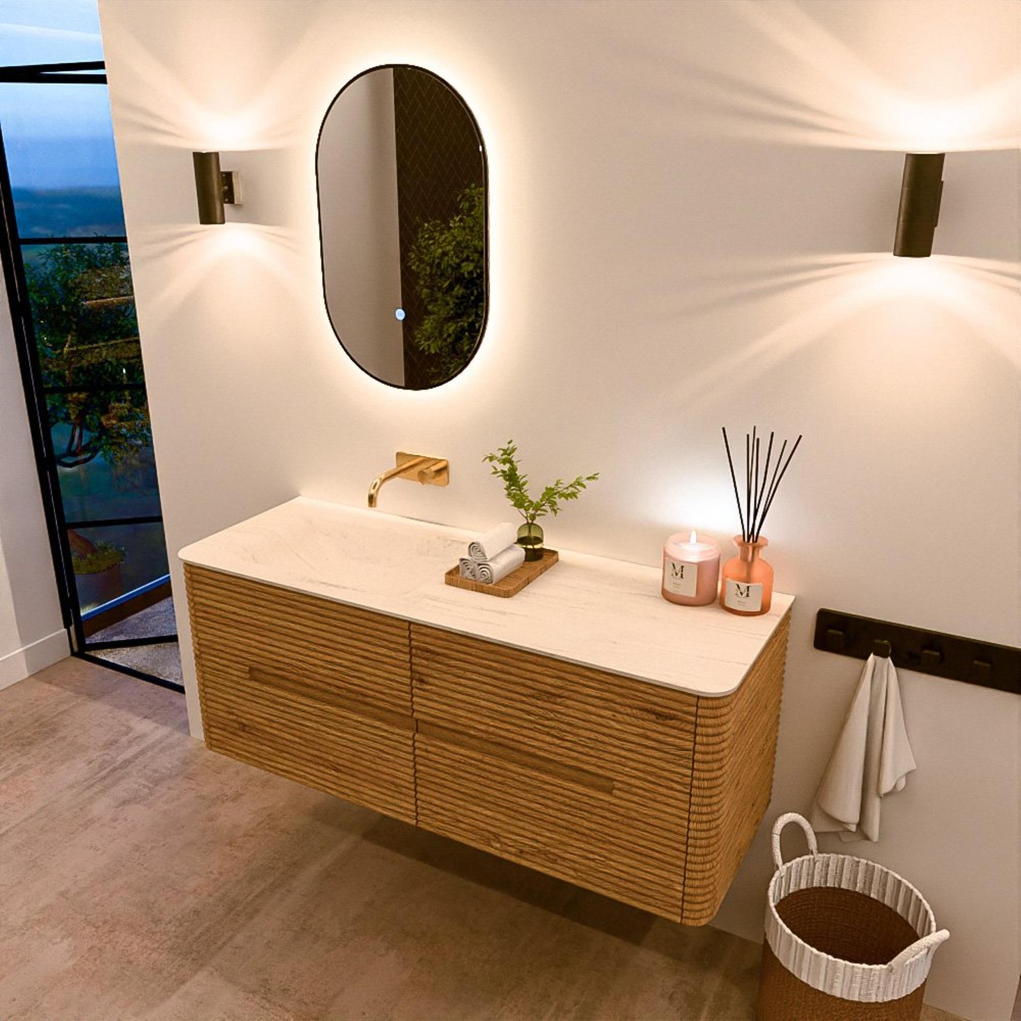 Mondiaz CIRO-DLUX Meuble de salle de bains - 130x45x50cm - Plan vasque solid surface Meli - 1 vasque à gauche - sans trous de robinet - 4 tiroirs - Chêne