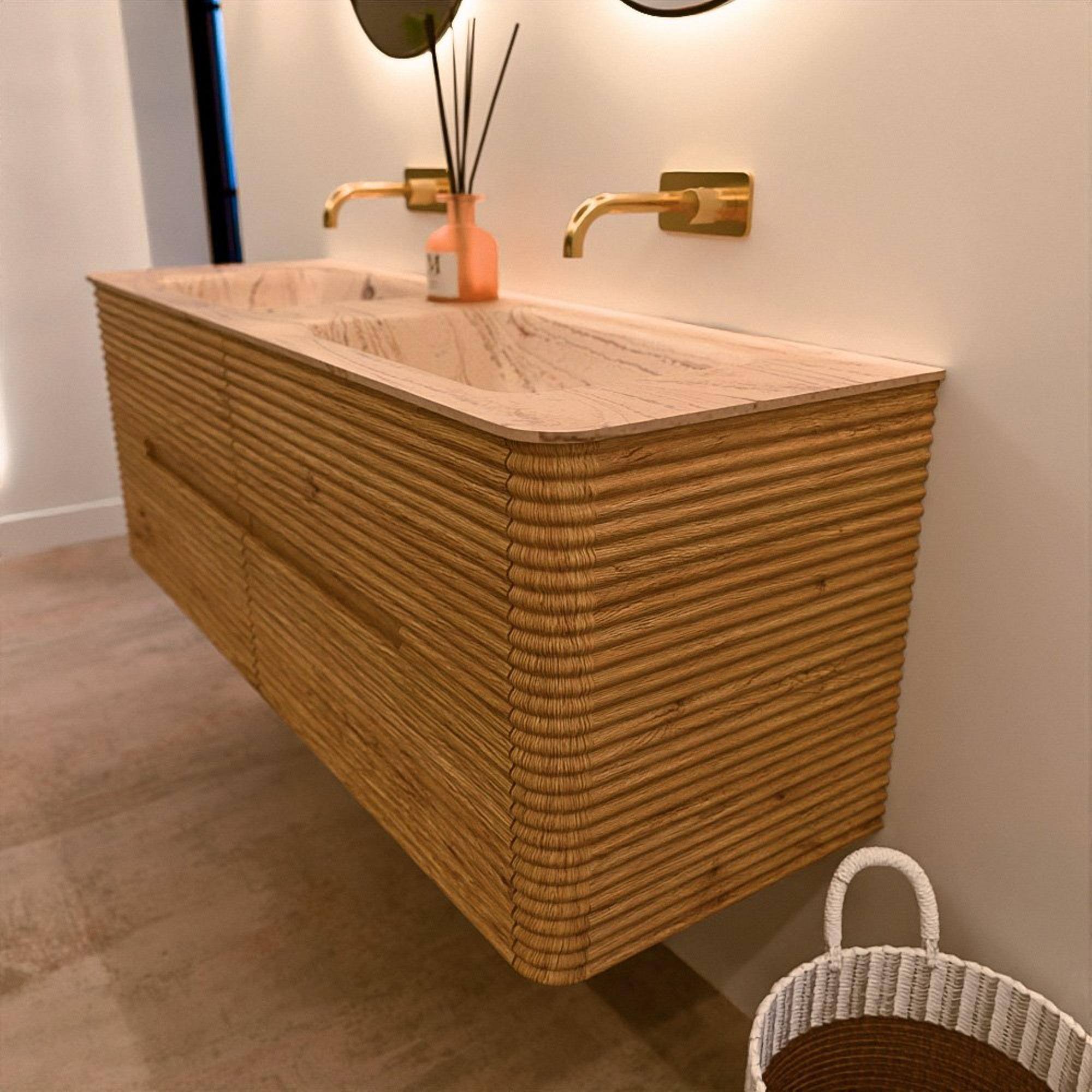 Mondiaz CIRO-DLUX Ensemble de meubles de salle de bains - 140x45x50cm - Plan vasque Solid surface Arena - 2 vasques Double - sans trous de robinetterie - 4 tiroirs - Chêne