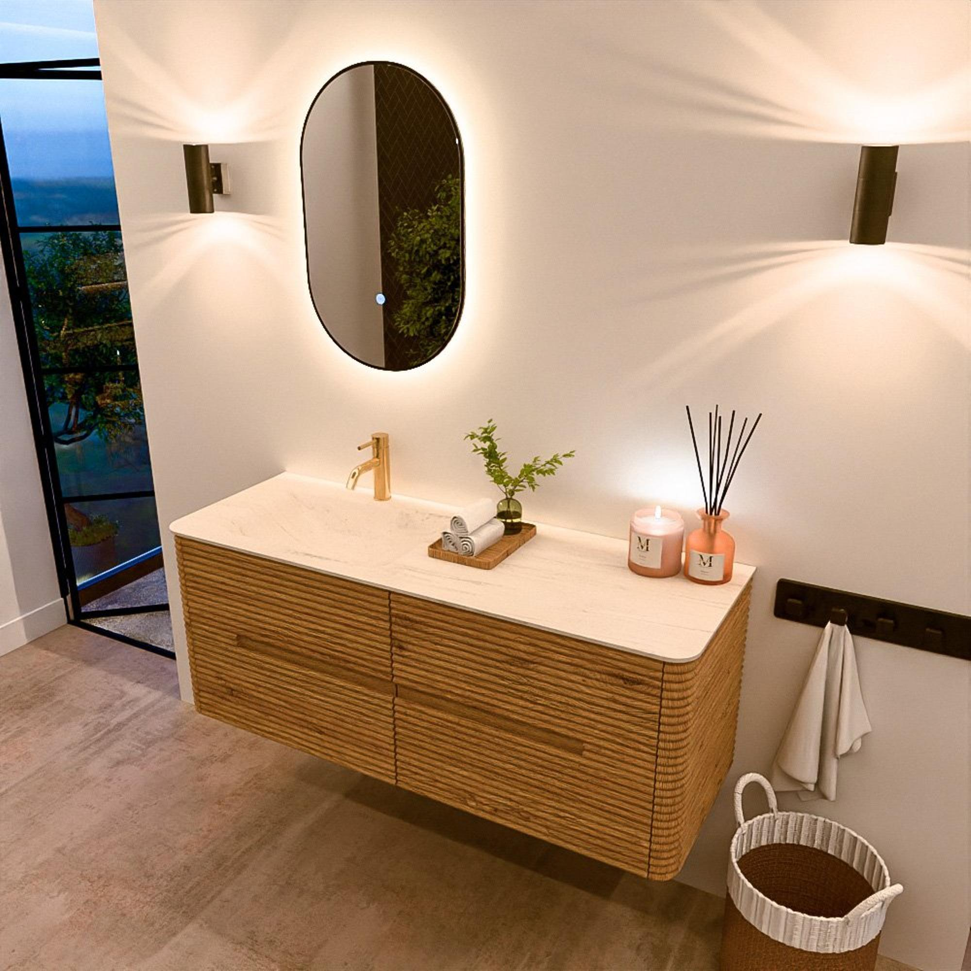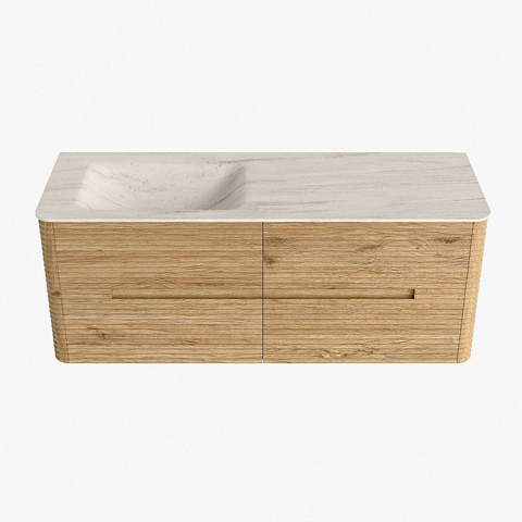 Mondiaz CIRO-DLUX Meuble de salle de bains - 130x45x50cm - Plan vasque Solid surface Meli - 1 vasque à gauche - 1 trou de robinet - 4 tiroirs - Chêne