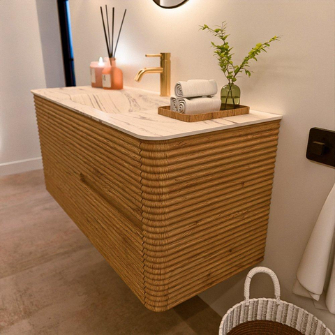 Mondiaz CIRO-DLUX Meuble de salle de bains - 110x45x50cm - Plan vasque solid surface Nata - 1 lavabo Central - 1 trou de robinet - 2 tiroirs - Chêne
