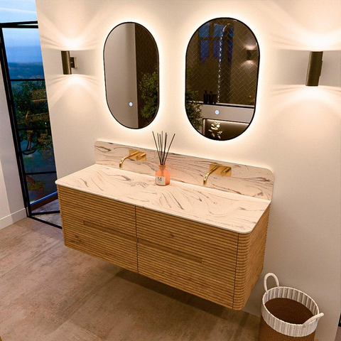 Mondiaz CIRO-DLUX Meuble de salle de bains - 140x45x50cm - Vasque solid surface Nata - 2 bassins Double - sans trous de robinetterie - 4 tiroirs - Chêne