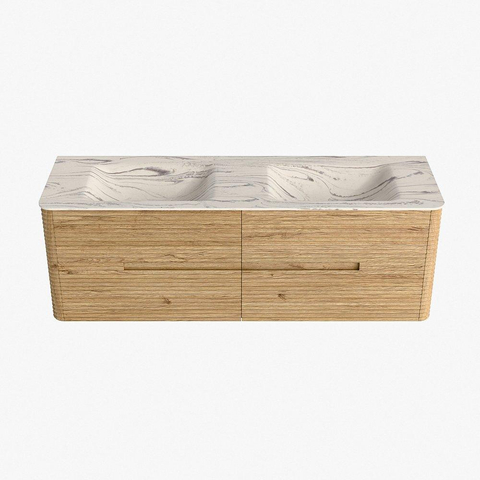 Mondiaz CIRO-DLUX Meuble de salle de bains set - 150x45x50cm - Plan-vasque solid surface Nata - 2 vasques double - sans trous de robinetterie - 4 tiroirs - Chêne