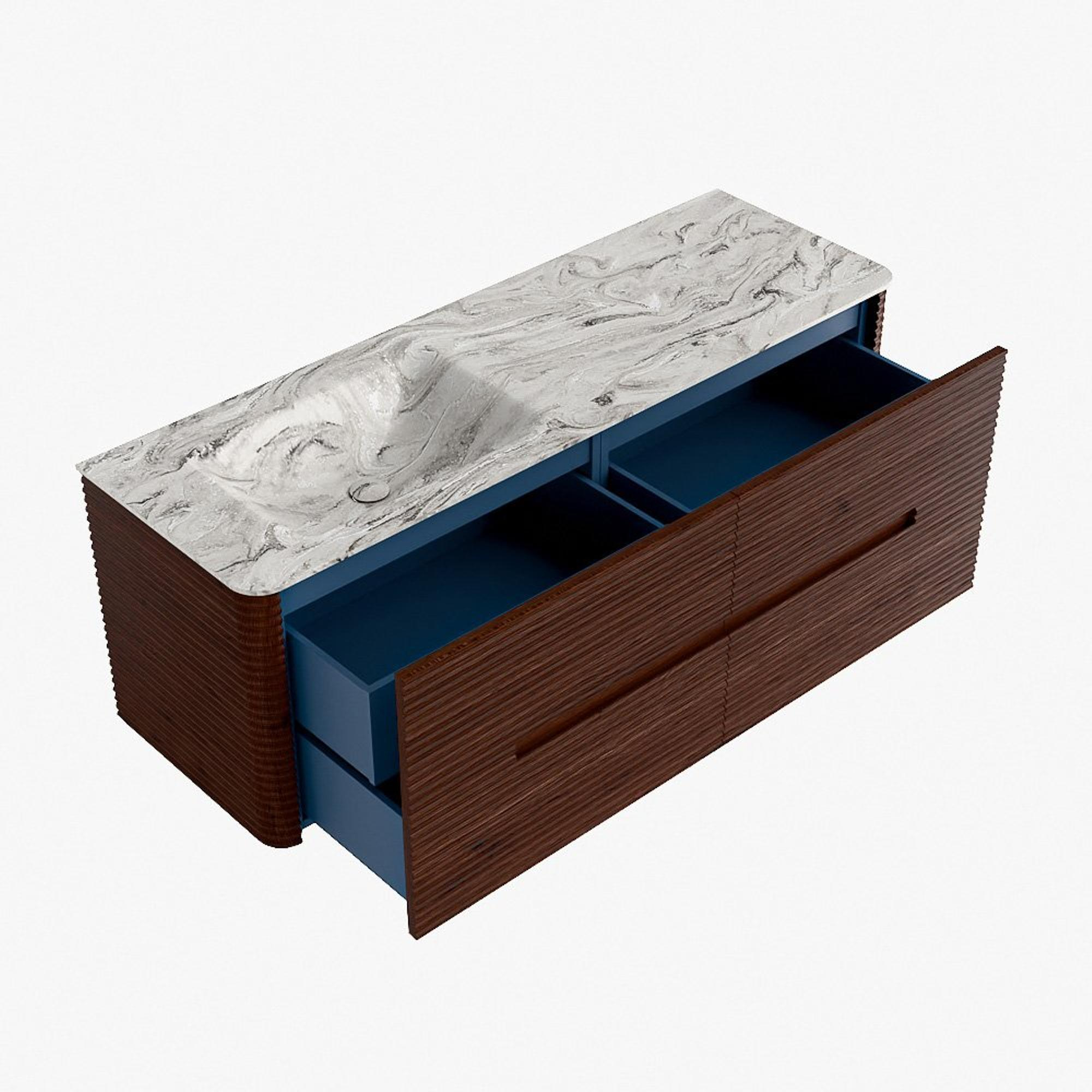 La praticité est un élément essentiel de la gamme CIRO. Le meuble dispose d’un grand tiroir avec un tiroir intérieur supplémentaire, idéal pour ranger de manière organisée tous les articles quotidiens de la salle de bain. Grâce à la poignée intégrée et au mécanisme de fermeture douce, la façade reste sobre, élégante et épurée.