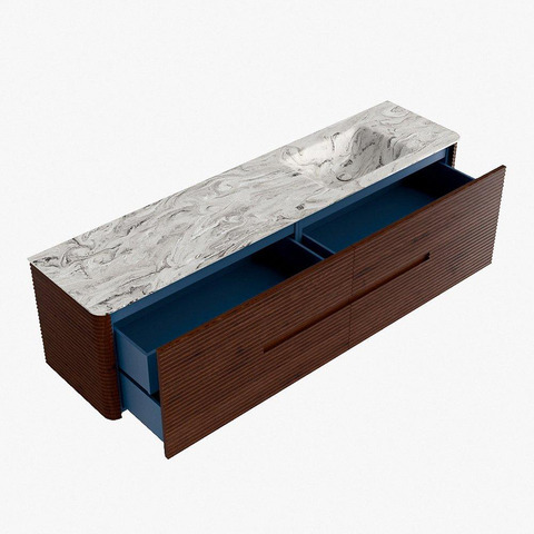 La praticité est un élément essentiel de la gamme CIRO. Le meuble dispose d’un grand tiroir avec un tiroir intérieur supplémentaire, idéal pour ranger de manière organisée tous les articles quotidiens de la salle de bain. Grâce à la poignée intégrée et au mécanisme de fermeture douce, la façade reste sobre, élégante et épurée.