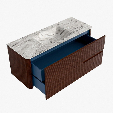 La praticité est un élément essentiel de la gamme CIRO. Le meuble dispose d’un grand tiroir avec un tiroir intérieur supplémentaire, idéal pour ranger de manière organisée tous les articles quotidiens de la salle de bain. Grâce à la poignée intégrée et au mécanisme de fermeture douce, la façade reste sobre, élégante et épurée.