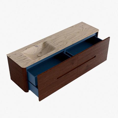 La praticité est un élément essentiel de la gamme CIRO. Le meuble dispose d’un grand tiroir avec un tiroir intérieur supplémentaire, idéal pour ranger de manière organisée tous les articles quotidiens de la salle de bain. Grâce à la poignée intégrée et au mécanisme de fermeture douce, la façade reste sobre, élégante et épurée.