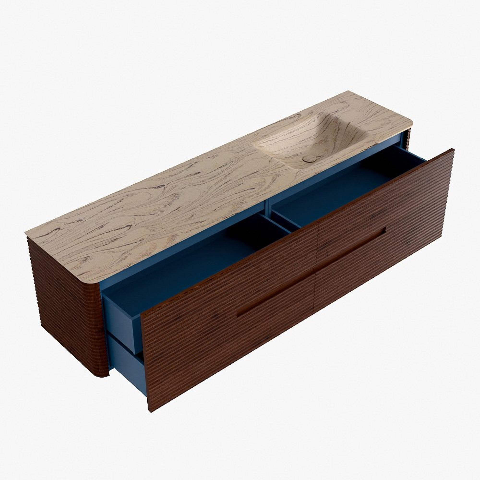 La praticité est un élément essentiel de la gamme CIRO. Le meuble dispose d’un grand tiroir avec un tiroir intérieur supplémentaire, idéal pour ranger de manière organisée tous les articles quotidiens de la salle de bain. Grâce à la poignée intégrée et au mécanisme de fermeture douce, la façade reste sobre, élégante et épurée.
