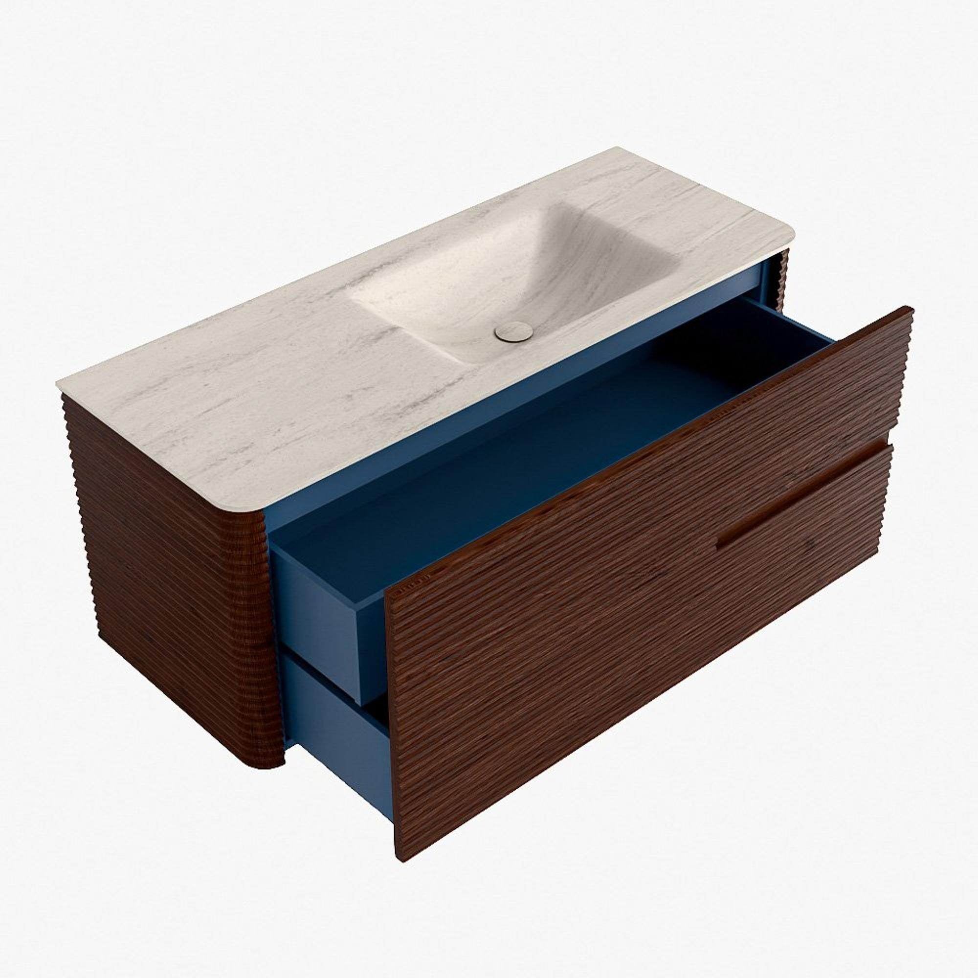 La praticité est un élément essentiel de la gamme CIRO. Le meuble dispose d’un grand tiroir avec un tiroir intérieur supplémentaire, idéal pour ranger de manière organisée tous les articles quotidiens de la salle de bain. Grâce à la poignée intégrée et au mécanisme de fermeture douce, la façade reste sobre, élégante et épurée.