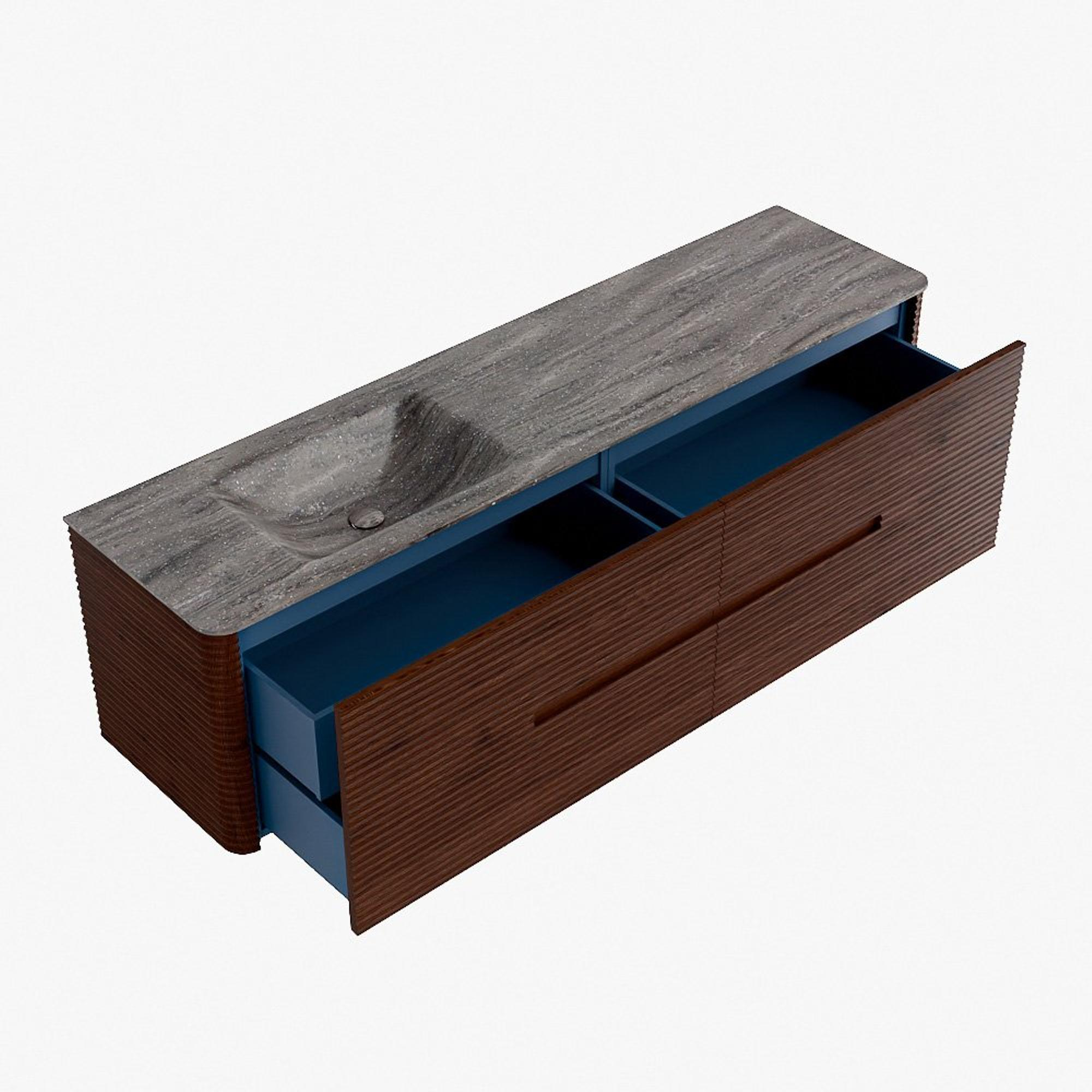La praticité est un élément essentiel de la gamme CIRO. Le meuble dispose d’un grand tiroir avec un tiroir intérieur supplémentaire, idéal pour ranger de manière organisée tous les articles quotidiens de la salle de bain. Grâce à la poignée intégrée et au mécanisme de fermeture douce, la façade reste sobre, élégante et épurée.
