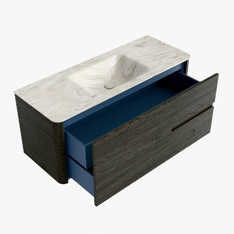 La praticité est un élément essentiel de la gamme CIRO. Le meuble dispose d’un grand tiroir avec un tiroir intérieur supplémentaire, idéal pour ranger de manière organisée tous les articles quotidiens de la salle de bain. Grâce à la poignée intégrée et au mécanisme de fermeture douce, la façade reste sobre, élégante et épurée.