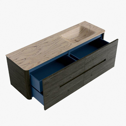 La praticité est un élément essentiel de la gamme CIRO. Le meuble dispose d’un grand tiroir avec un tiroir intérieur supplémentaire, idéal pour ranger de manière organisée tous les articles quotidiens de la salle de bain. Grâce à la poignée intégrée et au mécanisme de fermeture douce, la façade reste sobre, élégante et épurée.