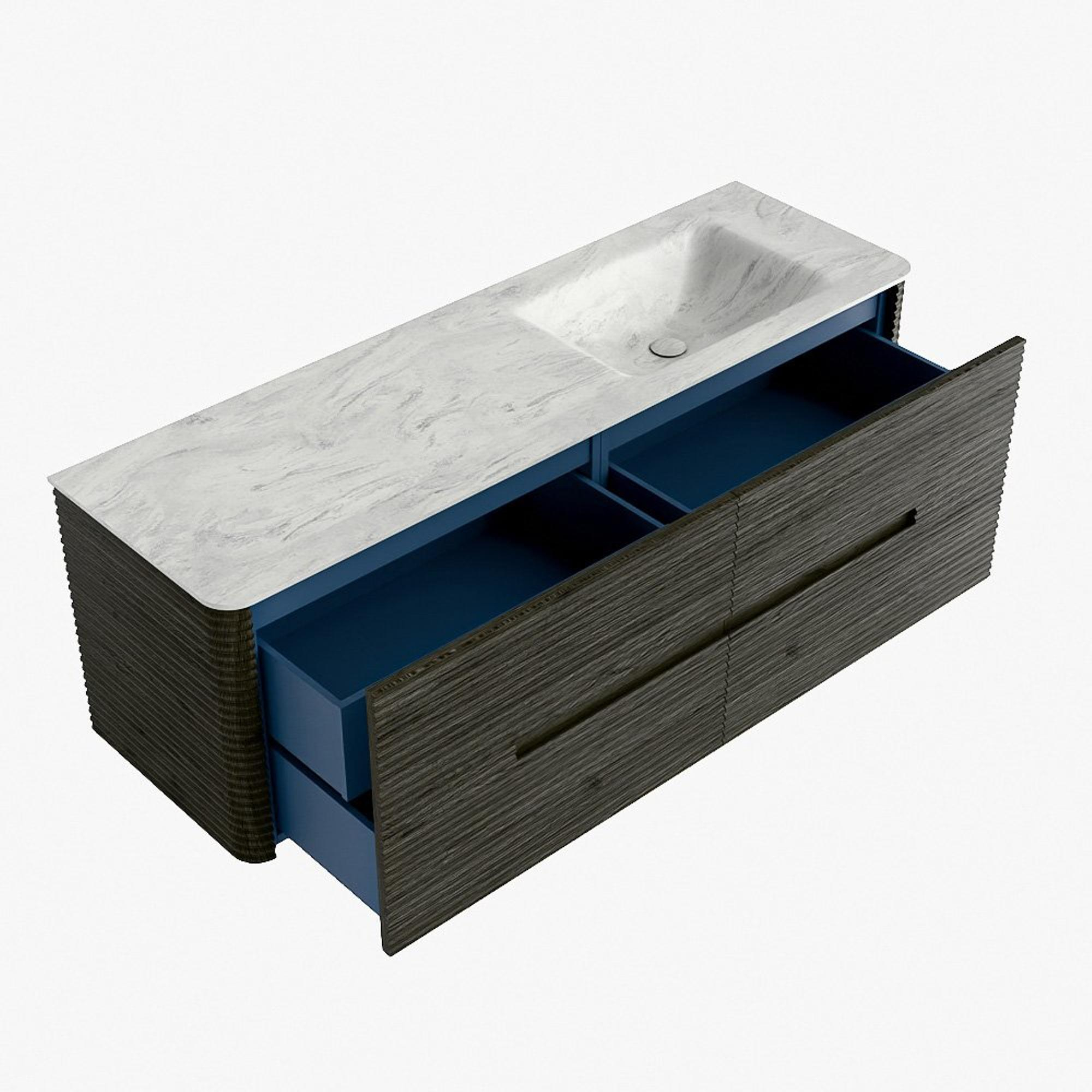La praticité est un élément essentiel de la gamme CIRO. Le meuble dispose d’un grand tiroir avec un tiroir intérieur supplémentaire, idéal pour ranger de manière organisée tous les articles quotidiens de la salle de bain. Grâce à la poignée intégrée et au mécanisme de fermeture douce, la façade reste sobre, élégante et épurée.