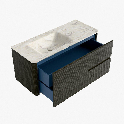 La praticité est un élément essentiel de la gamme CIRO. Le meuble dispose d’un grand tiroir avec un tiroir intérieur supplémentaire, idéal pour ranger de manière organisée tous les articles quotidiens de la salle de bain. Grâce à la poignée intégrée et au mécanisme de fermeture douce, la façade reste sobre, élégante et épurée.