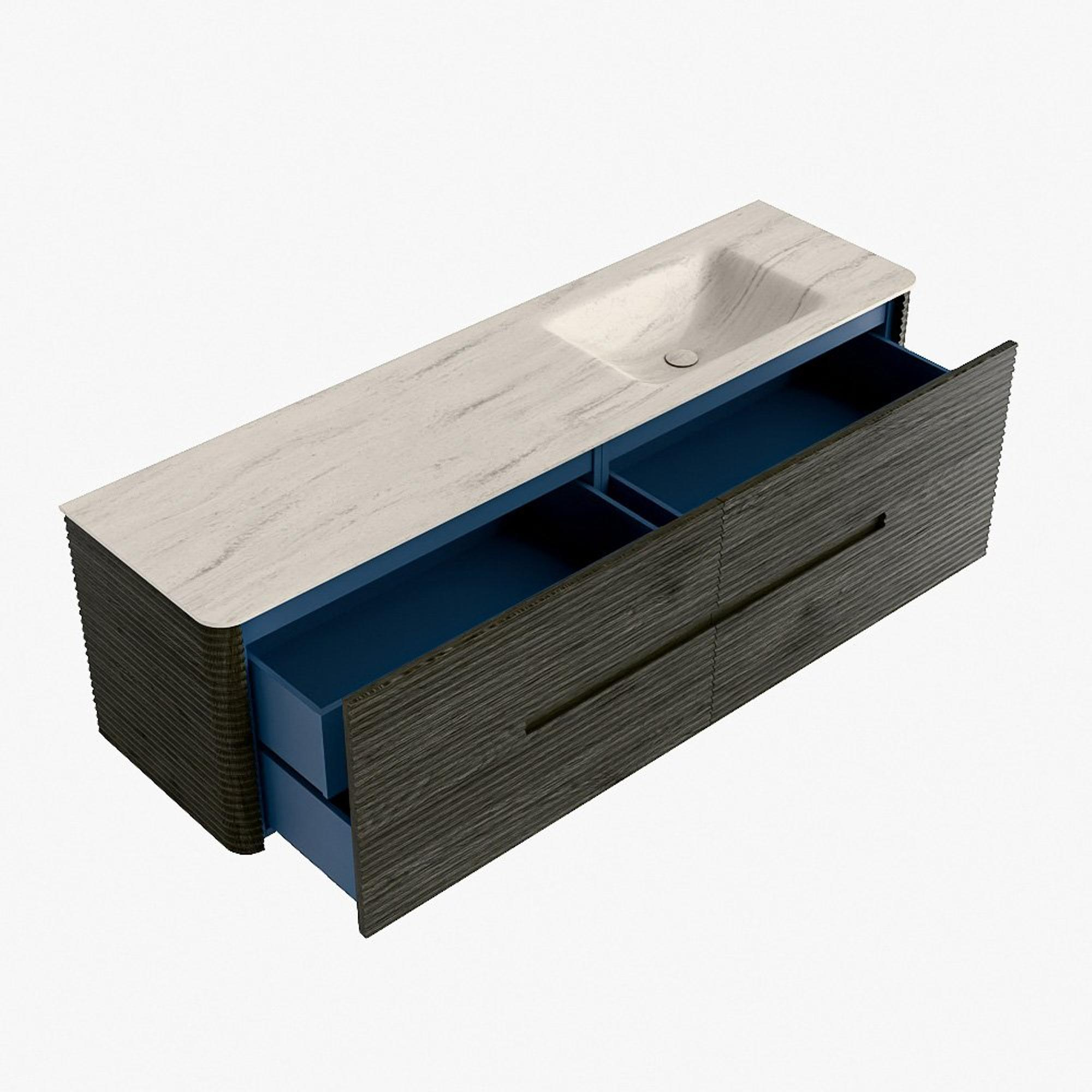La praticité est un élément essentiel de la gamme CIRO. Le meuble dispose d’un grand tiroir avec un tiroir intérieur supplémentaire, idéal pour ranger de manière organisée tous les articles quotidiens de la salle de bain. Grâce à la poignée intégrée et au mécanisme de fermeture douce, la façade reste sobre, élégante et épurée.