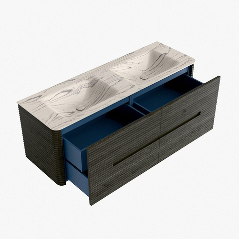 La praticité est un élément essentiel de la gamme CIRO. Le meuble dispose d’un grand tiroir avec un tiroir intérieur supplémentaire, idéal pour ranger de manière organisée tous les articles quotidiens de la salle de bain. Grâce à la poignée intégrée et au mécanisme de fermeture douce, la façade reste sobre, élégante et épurée.