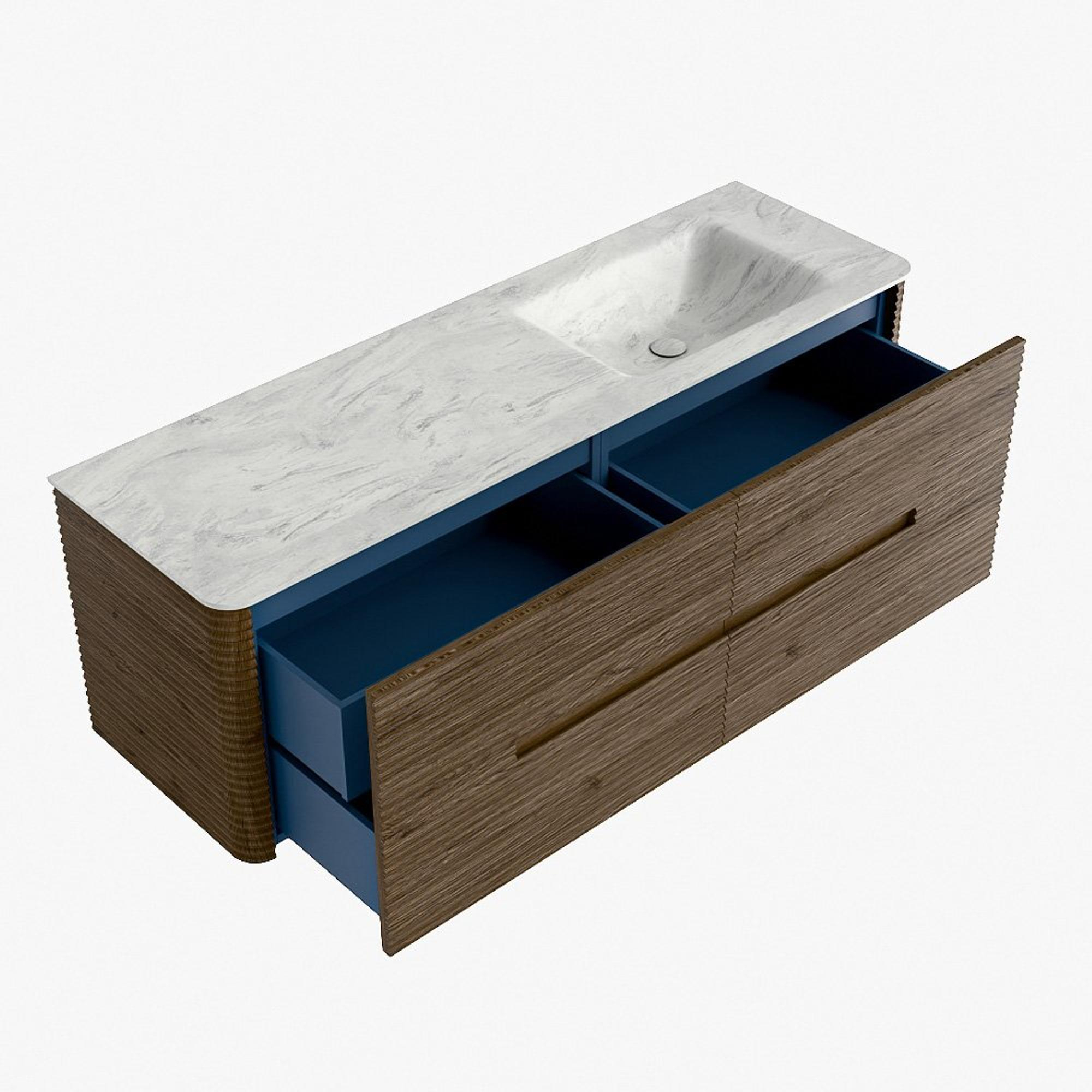 La praticité est un élément essentiel de la gamme CIRO. Le meuble dispose d’un grand tiroir avec un tiroir intérieur supplémentaire, idéal pour ranger de manière organisée tous les articles quotidiens de la salle de bain. Grâce à la poignée intégrée et au mécanisme de fermeture douce, la façade reste sobre, élégante et épurée.