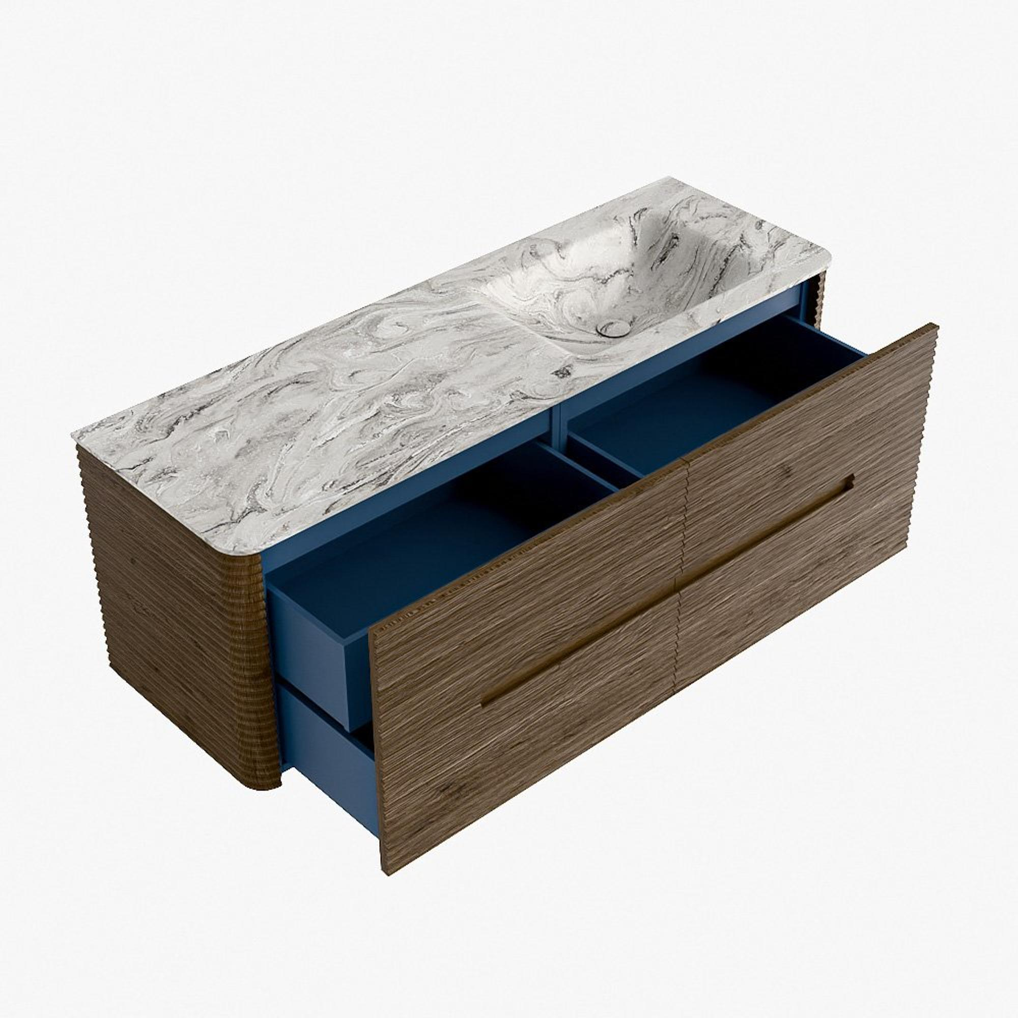 La praticité est un élément essentiel de la gamme CIRO. Le meuble dispose d’un grand tiroir avec un tiroir intérieur supplémentaire, idéal pour ranger de manière organisée tous les articles quotidiens de la salle de bain. Grâce à la poignée intégrée et au mécanisme de fermeture douce, la façade reste sobre, élégante et épurée.