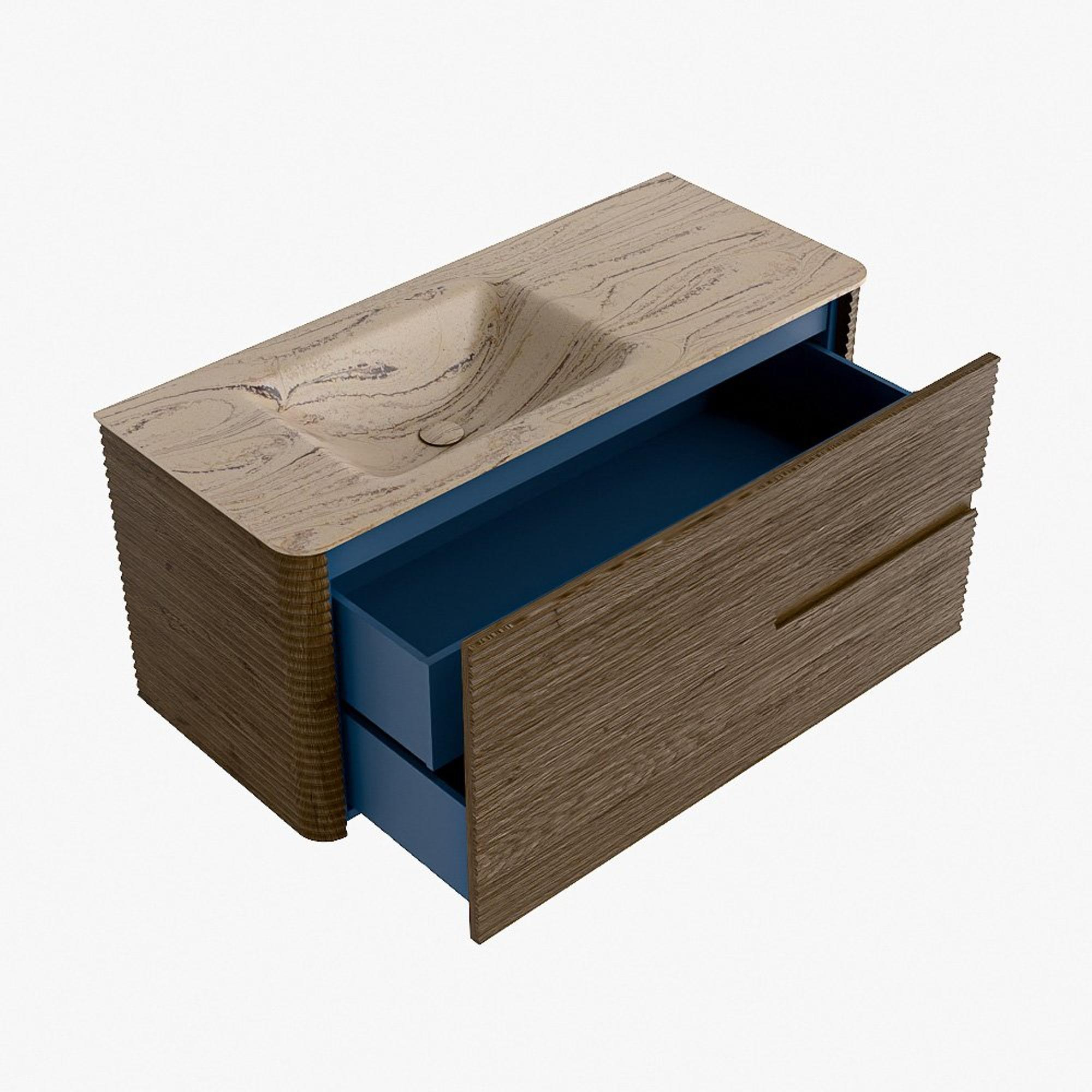 La praticité est un élément essentiel de la gamme CIRO. Le meuble dispose d’un grand tiroir avec un tiroir intérieur supplémentaire, idéal pour ranger de manière organisée tous les articles quotidiens de la salle de bain. Grâce à la poignée intégrée et au mécanisme de fermeture douce, la façade reste sobre, élégante et épurée.