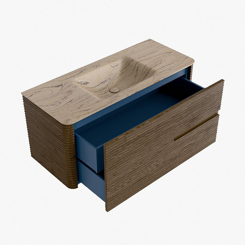 La praticité est un élément essentiel de la gamme CIRO. Le meuble dispose d’un grand tiroir avec un tiroir intérieur supplémentaire, idéal pour ranger de manière organisée tous les articles quotidiens de la salle de bain. Grâce à la poignée intégrée et au mécanisme de fermeture douce, la façade reste sobre, élégante et épurée.