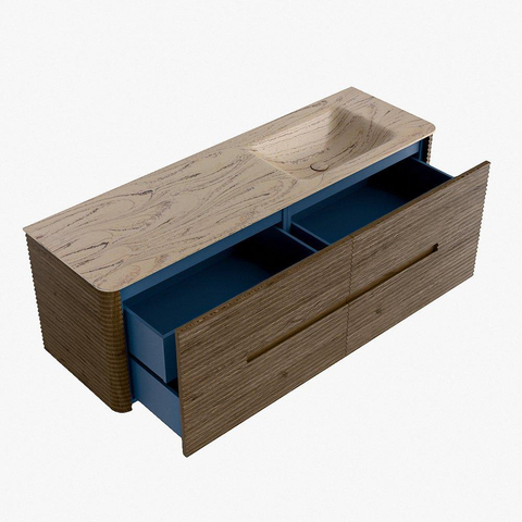 La praticité est un élément essentiel de la gamme CIRO. Le meuble dispose d’un grand tiroir avec un tiroir intérieur supplémentaire, idéal pour ranger de manière organisée tous les articles quotidiens de la salle de bain. Grâce à la poignée intégrée et au mécanisme de fermeture douce, la façade reste sobre, élégante et épurée.