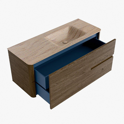 La praticité est un élément essentiel de la gamme CIRO. Le meuble dispose d’un grand tiroir avec un tiroir intérieur supplémentaire, idéal pour ranger de manière organisée tous les articles quotidiens de la salle de bain. Grâce à la poignée intégrée et au mécanisme de fermeture douce, la façade reste sobre, élégante et épurée.