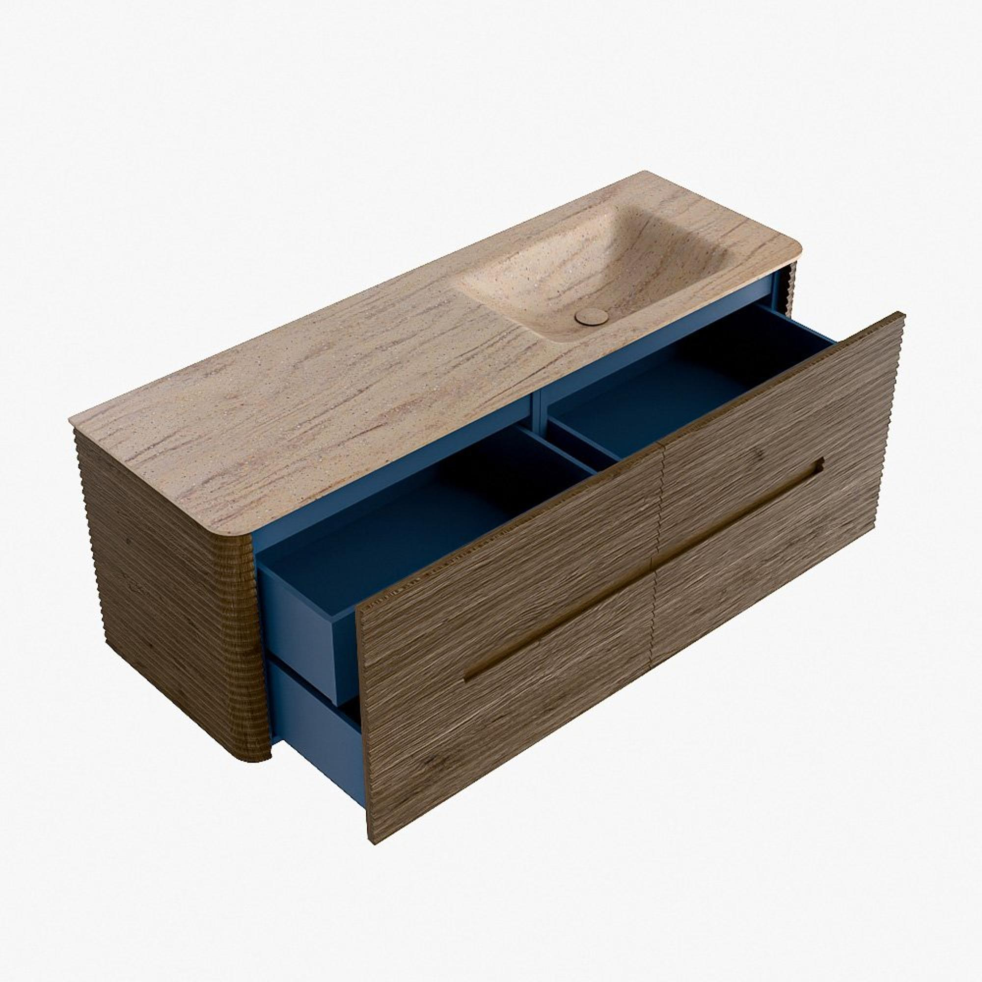 La praticité est un élément essentiel de la gamme CIRO. Le meuble dispose d’un grand tiroir avec un tiroir intérieur supplémentaire, idéal pour ranger de manière organisée tous les articles quotidiens de la salle de bain. Grâce à la poignée intégrée et au mécanisme de fermeture douce, la façade reste sobre, élégante et épurée.