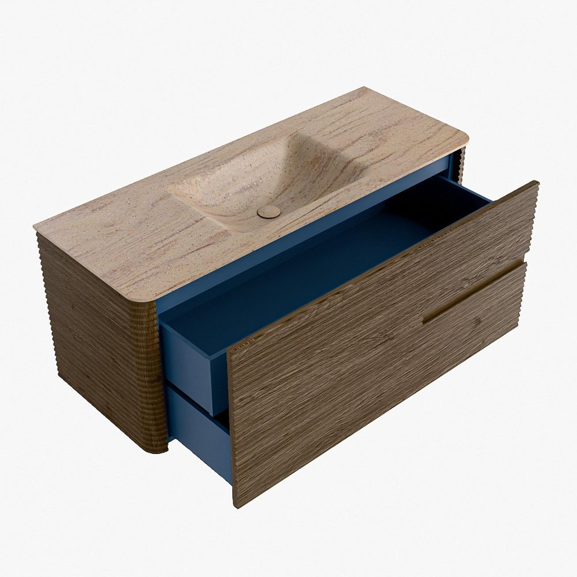 La praticité est un élément essentiel de la gamme CIRO. Le meuble dispose d’un grand tiroir avec un tiroir intérieur supplémentaire, idéal pour ranger de manière organisée tous les articles quotidiens de la salle de bain. Grâce à la poignée intégrée et au mécanisme de fermeture douce, la façade reste sobre, élégante et épurée.