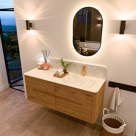 Mondiaz CIRO-DLUX Meuble de salle de bains - 130x45x50cm - Plan vasque solid surface Opalo - 1 vasque à droite - 1 trou de robinet - 4 tiroirs - Chêne